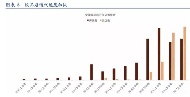 现制茶饮行业因为门槛低,同质化严重,关店率较高。我国现制茶饮店在新增店铺快速增长的同时,也有大量的店铺在选择关闭。根据美团点评的数据显示,自2016年下半年开始饮品店显著超过开店数量,2017年上半年饮品店关店数量更是开店数量的1.3倍。