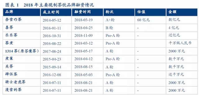 2018年是现制茶饮市场“疯狂”的一年,在一二级市场资金紧张背景下,据不完全统计,该细分行业仅几家明星品牌全年融资就超过10亿元。奈雪の茶更以A+轮60亿估值成为我国现制茶饮行业第一个独角兽企业,喜茶单轮融资额达到4亿元,众多成立于2014-2016年的现制茶饮品牌在2018年迎来了集中融资风潮,且融资金额均在1000万元以上。