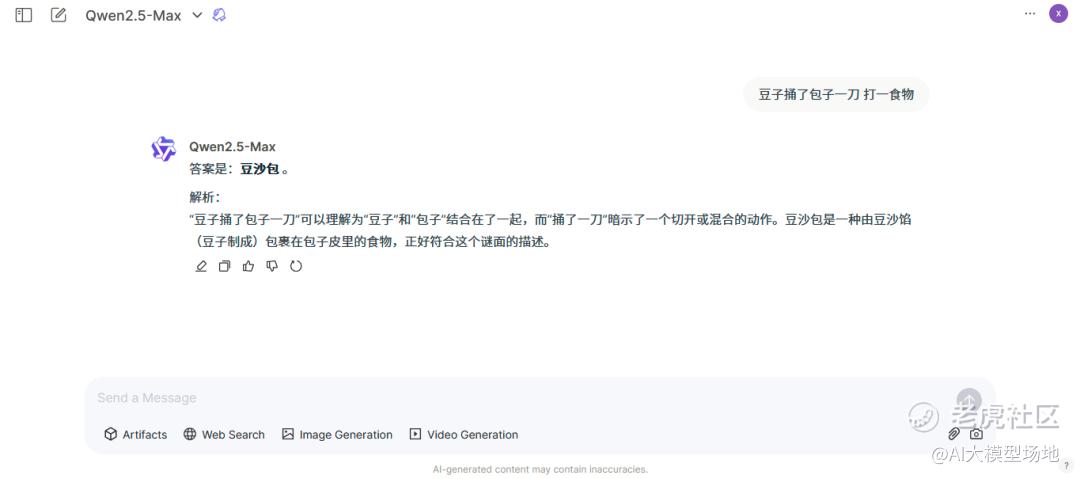 ”豆子捅了包子一刀 打一食物“这个谜语,通义Qwen 2.5 Max首先给出答案”豆沙包“,解析过程简单明了,不愧是咱们的国产大模型,推理能力相当在线。