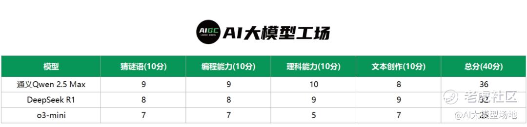 从评分结果来看,通义 Qwen 2.5 Max 以总分 36 分的优异成绩拔得头筹,其在理科问题和编程问题上的表现尤为出色,展现出强大的综合实力。DeepSeek R1 以总分 32 分紧随其后,在文本创作、猜谜语、理科问题以及编程问题上同样发挥稳定,基本扣分项都是在用户体验上。O3-mini 则以总分 25 分位列第三,整体表现相对较为平庸,需要在专业知识、逻辑推理和编程能力等方面进一步提升。