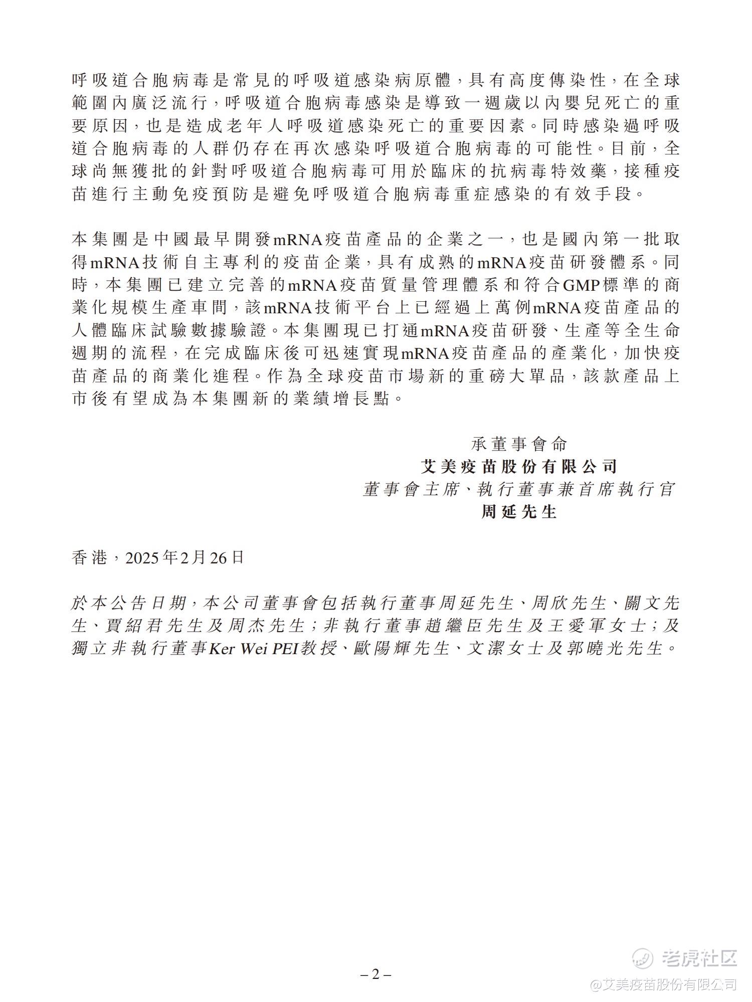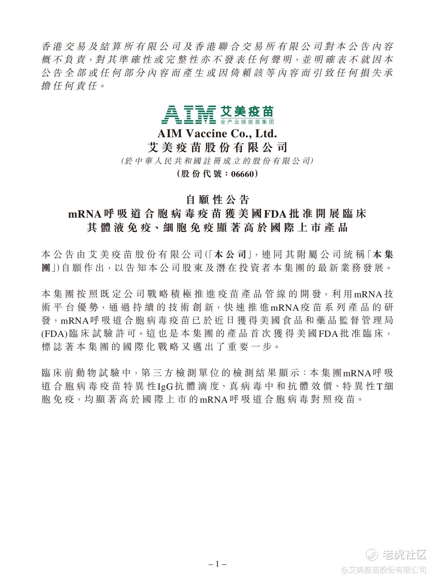 自愿性公告 - mRNA呼吸道合胞病毒疫苗获美国FDA批准开展临床其体液免疫、细胞免疫显著高于国际上市产品