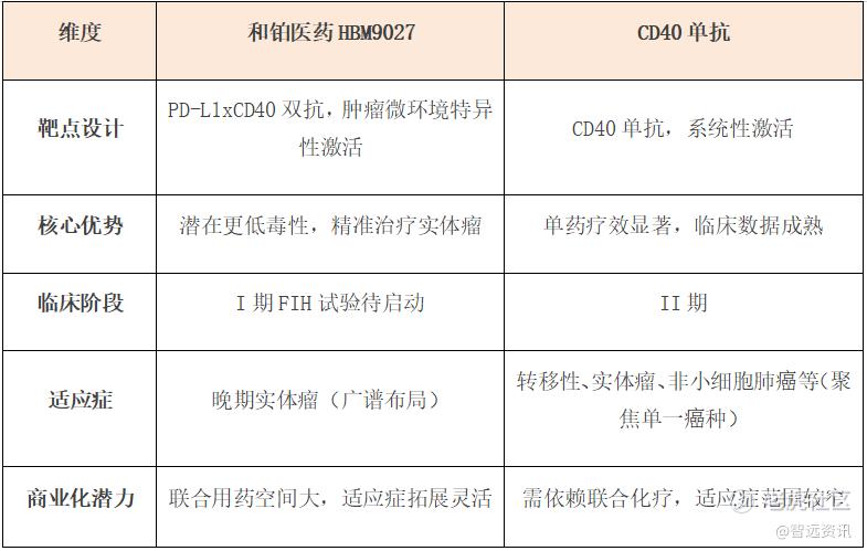 尽管同属CD40靶点,HBM9027对临床痛点的有着自己独到的解题思路。在靶点设计、核心优势、临床阶段、适应症、商业化潜力等方面,与CD40单抗对比,其领先价值不容忽视。