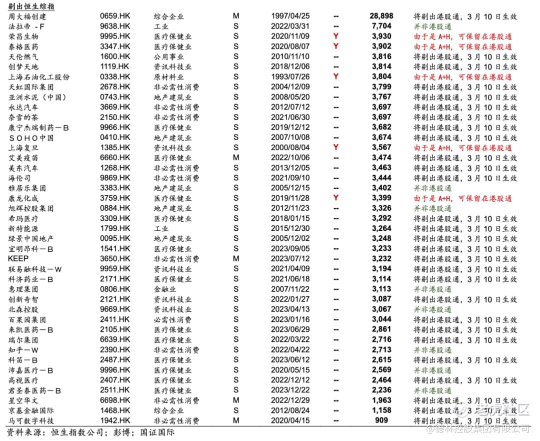 图3:预计被调出港股通的28家公司,资料来源:恒生指数公司;彭博;国证国际