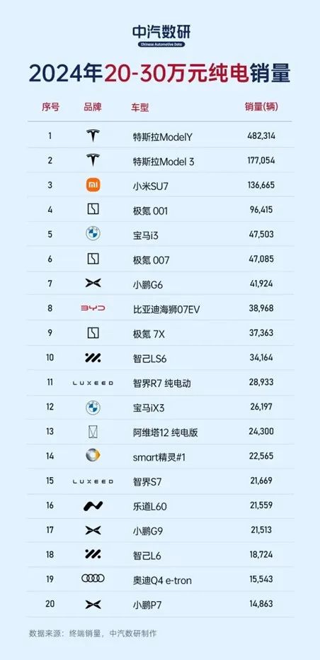 首先来看看,资本市场期望值最高的小米汽车现在市场上处在什么位置。根据乘联会的统计,2024年小米SU7销售了136665辆,在电动车中排第21名,在20-30万元价位的纯电车中排第三,仅次于特斯拉Model Y和Model 3,且跟第四名拉开了极大的差距。