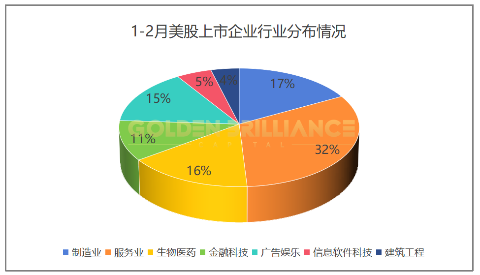 根据2025年1-2月的数据,中企赴美上市的企业在不同行业的分布情况显示,服务业以32%的比例占据了最大份额,成为中企上市的主要行业。制造业和生物医药行业分别以17%和16%的比例紧随其后,显示出这两个行业在资本市场上的活跃度。广告娱乐行业占比15%,金融科技行业占比11%,这两个行业的企业赴美上市的比例也较为显著,反映出其在资本市场中的吸引力和潜力。信息软件科技行业占比5%,虽然相对较小,但仍然是美股市场的重要组成部分。建筑工程行业占比最小,仅为4%,这可能与其资本密集型特性有关。