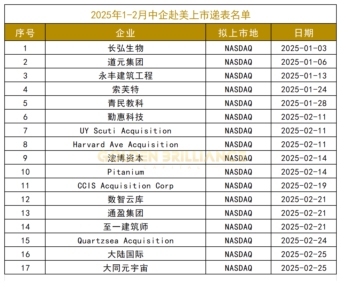 2025年前两个月共有17家中企递交美股上市申请,且全部拟纳斯达克上市。具体为:长弘生物、道元集团、永丰建筑工程、索芙特、青民教科、勤惠科技、UY Scuti Acquisition、Harvard Ave Acquisition、浤博资本、Pitanium、CCIS Acquisition Corp、数智云库、通盈集团、至一建筑师、Quartzsea Acquisition、大陆国际、大同元宇宙。