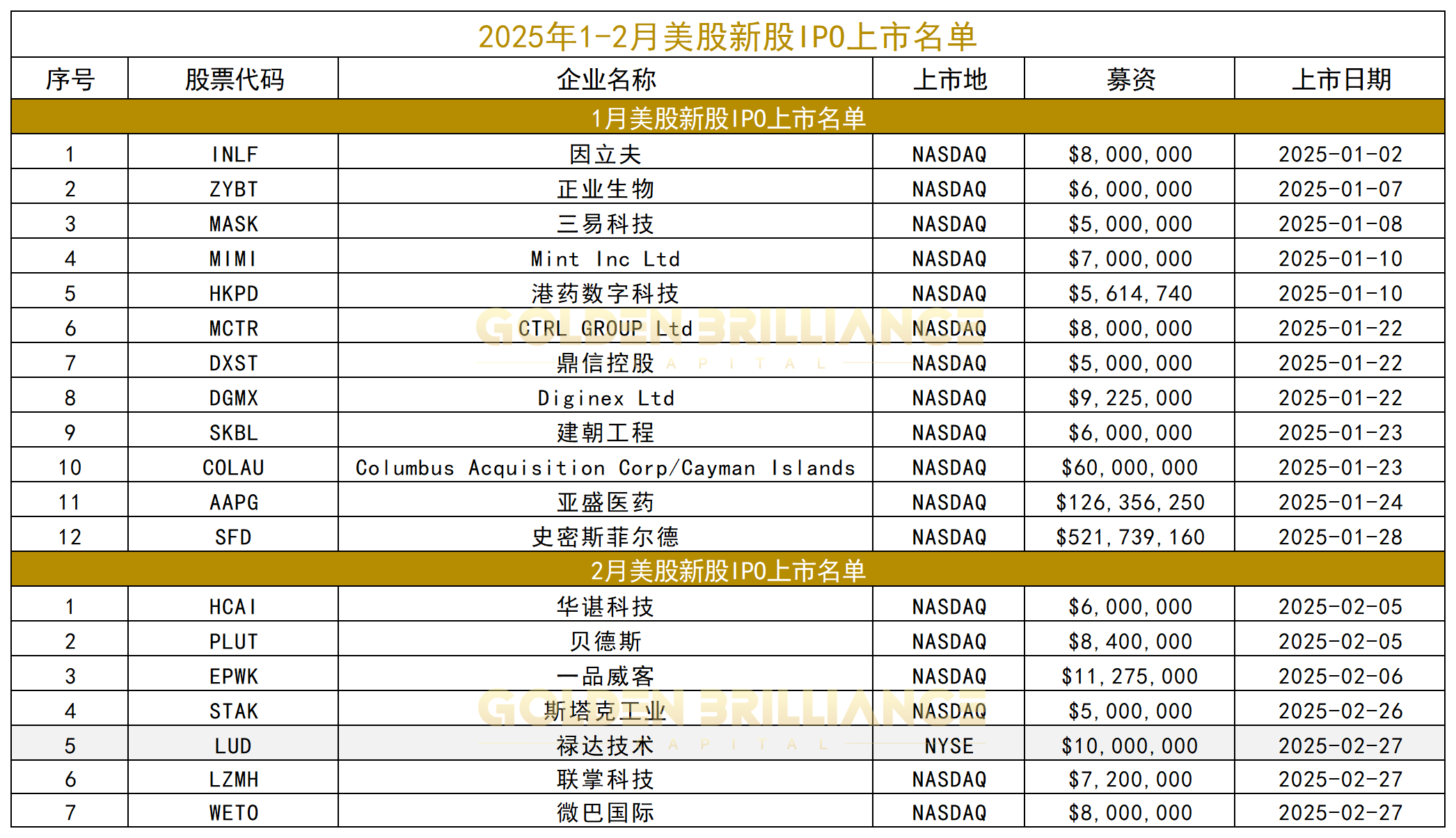 根据Golden Brilliance Capital Limited的数据分析,本期我们将对2025年前两个月美股市场的IPO表现进行深入探讨。