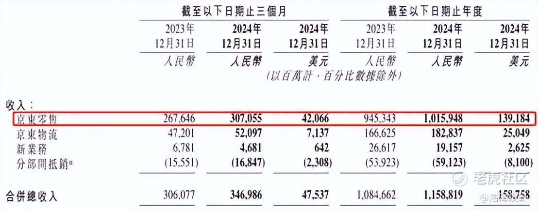 得益于此,2024年,京东零售业务收入规模首破万亿(分部抵消前)。