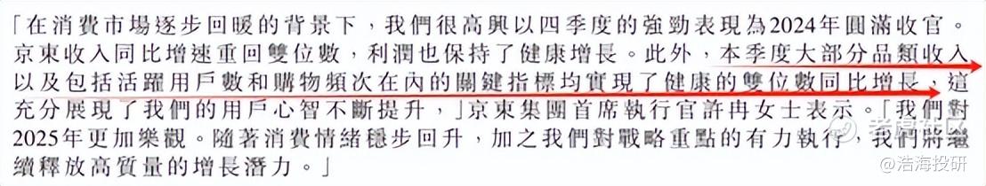 2024年第四季度,京东大部分品类收入以及活跃用户数、购物频次,均实现双位数同比增长,其中商超品类实现了连续四个季度的双位数增长。