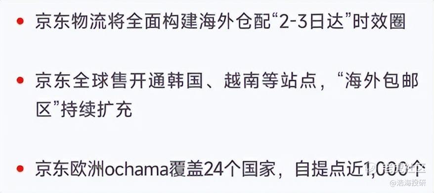 物流是零售业务的基础。京东全球售已开通韩国、越南等站点,“海外包邮区”持续扩充;京东欧洲ochama(超级仓店)已覆盖24个国家,自提点近1000个。