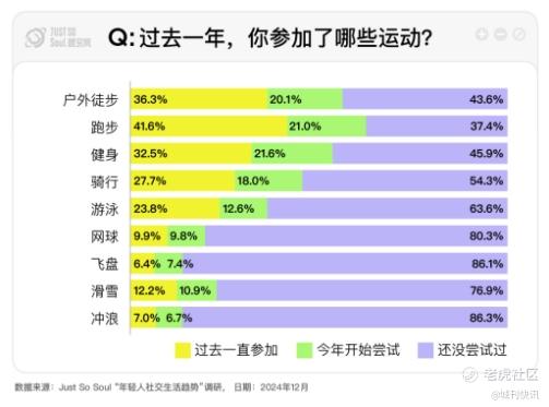 报告指出,在充满不确定性的外部环境中,Z世代正在通过“最小单位确定性”,即对身体的“掌控”,来寻回对生活的确定性。数据显示,2024年,户外运动成为Z世代热门的生活方式,Soul平台上的相关话题讨论热度同比增长25%。跑步、健身、骑行等活动备受推崇,新兴运动如滑雪、网球、飞盘等也吸引了大量年轻用户的关注。对于年轻人来说,运动不仅是保持健康的良好习惯,更是他们释放压力、建立连接的重要途径。调研显示,超过六成的受访者在情绪低落时会选择户外运动,在大自然中获得心灵慰藉。