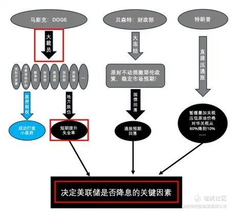 目前政府效率部正在进一步扩大影响力。未来的趋势会非常清晰,接下来几个月美国的官方失业率将会上升,而这将直接有利于美联储实施降息。特朗普的决策逻辑我在《DOGE 进行时——裁员的闭环逻辑》一文中制作了一张图,今天把它重新拿过来方便大家观察。