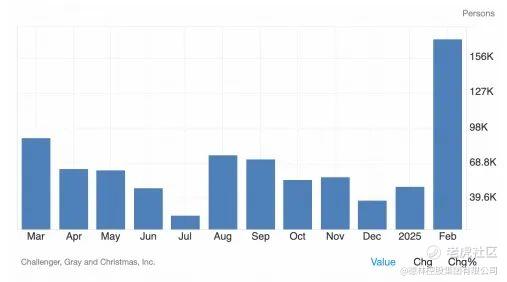 大家不要只看政府效率部在联邦政府层面裁了几个人,而要看联邦政府这一示范效应将会带来多少短期失业,尤其是地方政府和大企业都跟进的情况下会发生什么?下图是2月份的美国裁员人数,高达17.2万人,比1月增加了225%。其中政府直接裁员6.2万,零售业裁员3.9万,科技行业裁员1.5万。1-2月美国雇主累计裁员22.2万人,是2009年以来最高纪录。