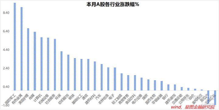 月内来看,国防军工(9.5%)、有色金属、美容护理、传媒等涨幅均超6%;石油石化(-1.56%)、房地产、家用电器、综合、公用事业等涨幅靠后。