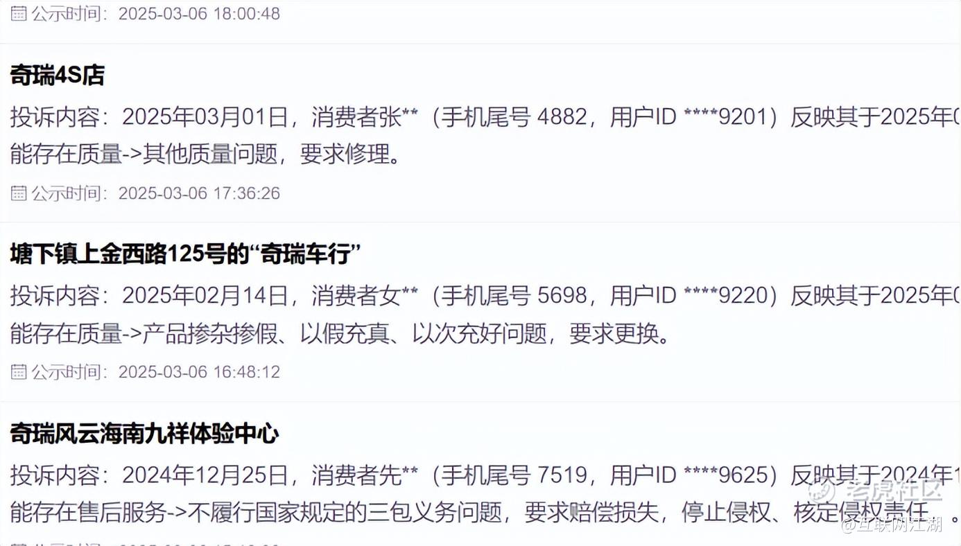根据全国12315消费投诉信息公示平台显示,奇瑞存在的投诉问题并不少。