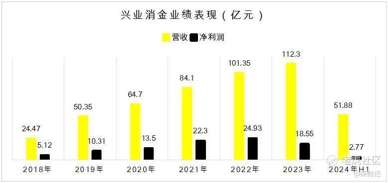 2022年,兴业消金走上人生巅峰,营收突破百亿大关,达到101.35亿元,净利润飙升到24.93亿元。