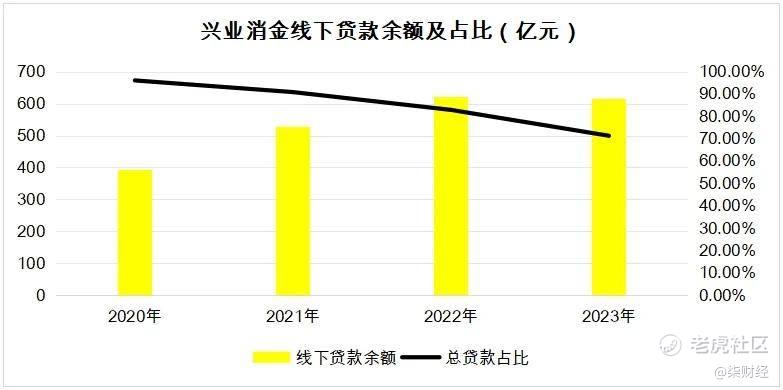 回拨时间轴,从2020年—2023年,兴业消金线下贷款余额占比从96.08%压缩到了71.33%。