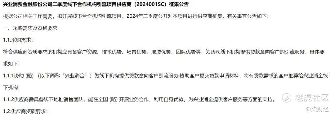 柒财经在采招网看到,2024年5月,兴业消金发布了二季度线下合作机构引流项目供应商征集公告,称根据公司相关工作需要,拟开展线下合作机构引流项目,现公开进行供应商征集,要求具备线下地推销售团队,能开展业务合作,拥有客户资源、技术优势、地域优势等,采购需求为协助兴业消金为线下机构提供贷款意向客户引流服务。