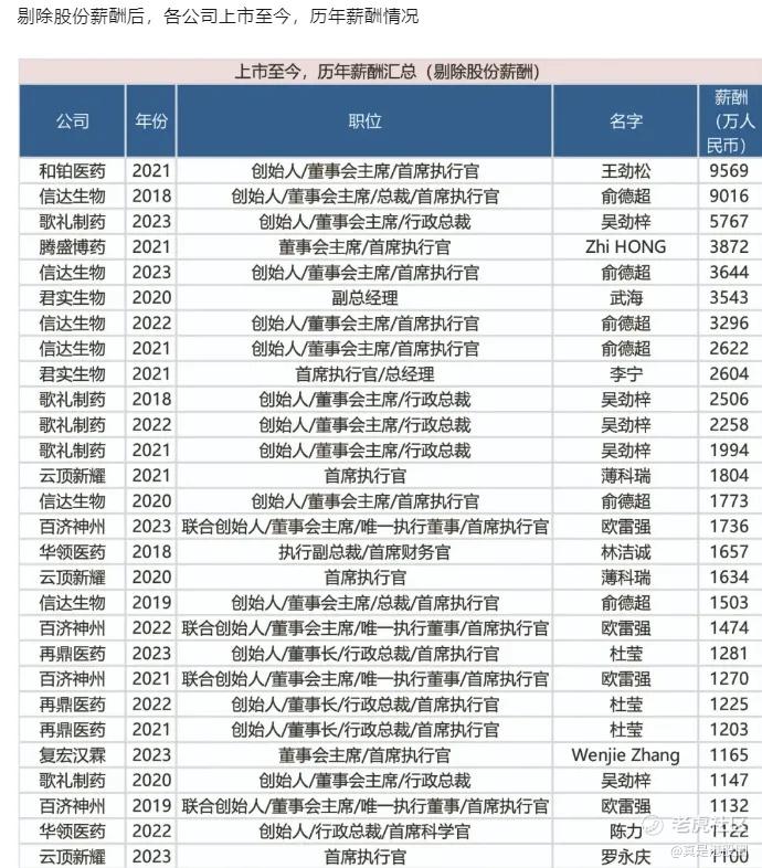 只有百济神州,工资与成绩匹配,作为300亿营收,2000亿市值的中国医药龙头,身兼数职,这是欧雷强应得的,但其他公司呢?市值几个亿,亏损累累,项目都没钱推进,老板还比欧雷强多拿几倍工资。