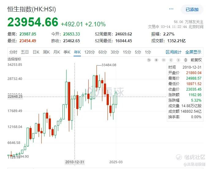 综合的回报分红率高于美股,所以港股2024年的涨幅就基本能跟美股持平。2024年,东升西落的口号还没有喊出来,外资也没有加仓,但港股也还是涨,能保持跟美股差不多的涨幅。