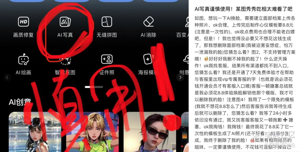 结果,经过用户几番操作,先是开通免费试用,找到专属VIP客服,没曾想问题依旧得不到解决,拉扯几轮,最终还是花了点钱买了对应的AI功能,才总算是删掉了自己的面部档案。面对这样的遭遇,心累的用户发出了“谨慎使用”的避雷话语。