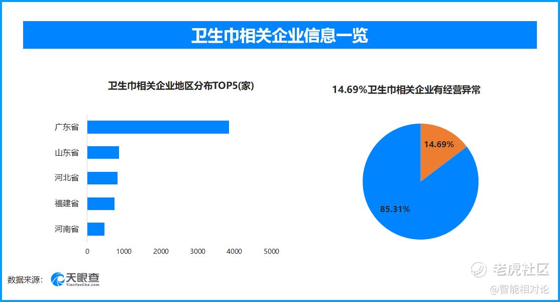 天眼查天眼风险显示,从事卫生巾相关的业务企业中,8.19%的相关企业曾出现法律诉讼,14.69%的相关企业曾出现经营异常,3.45%的相关企业曾出现行政处罚。