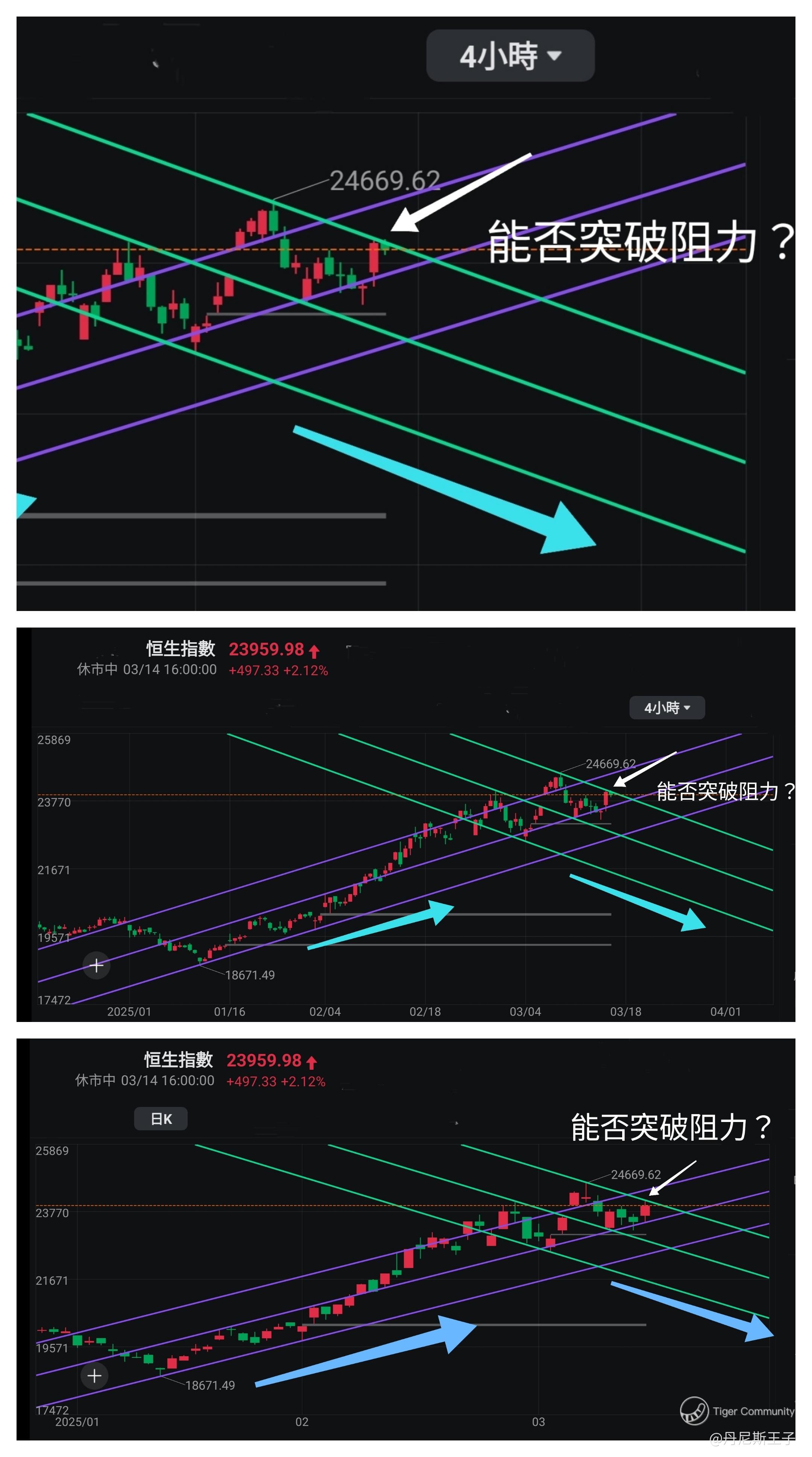 从图中所见可看到两条通道线,一条向上走,一条向下走。当前恒生指数正升至下降通道线上轴顶部,看能否突破?