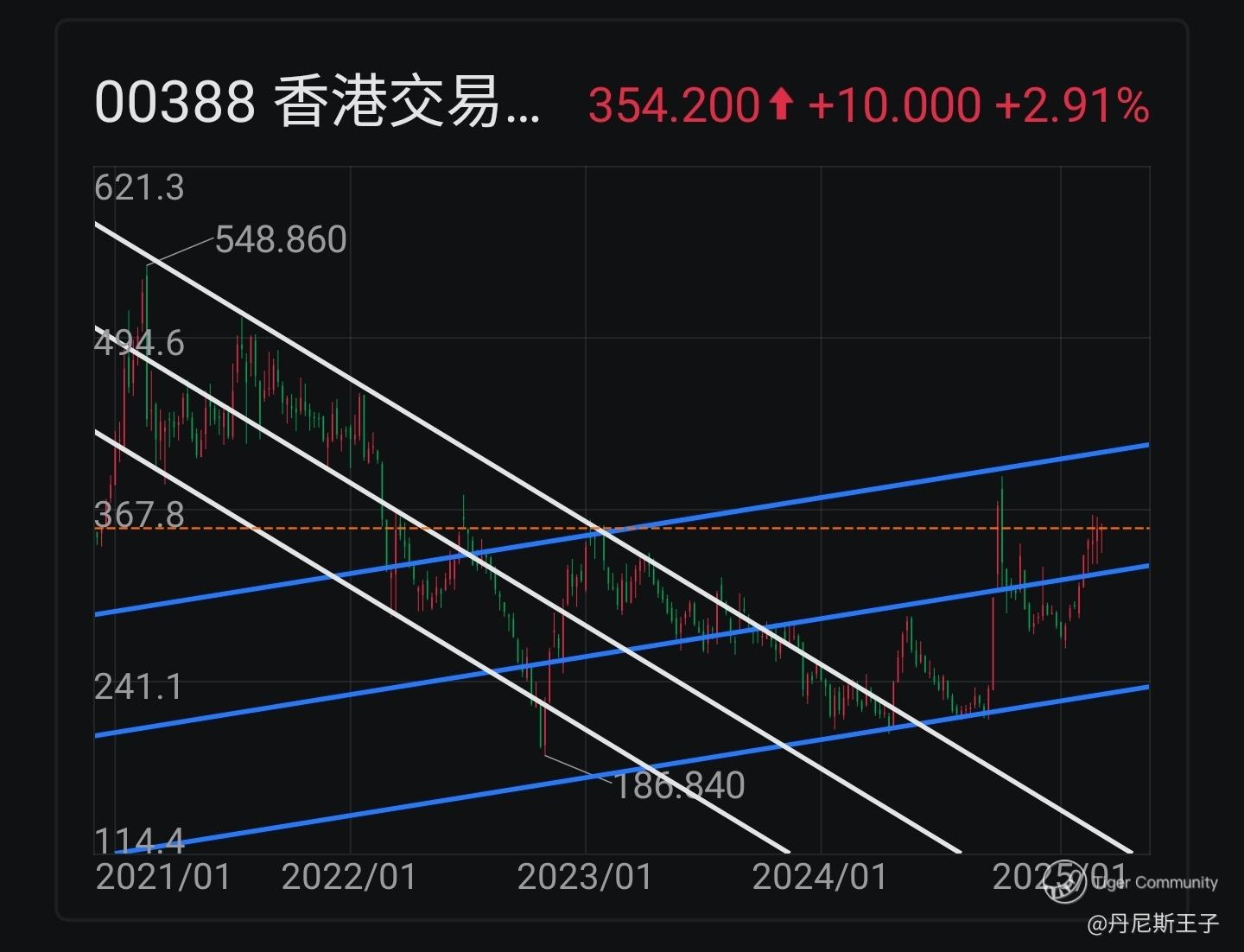 香港交易所 (00388.HK) 沿著上升通道线走