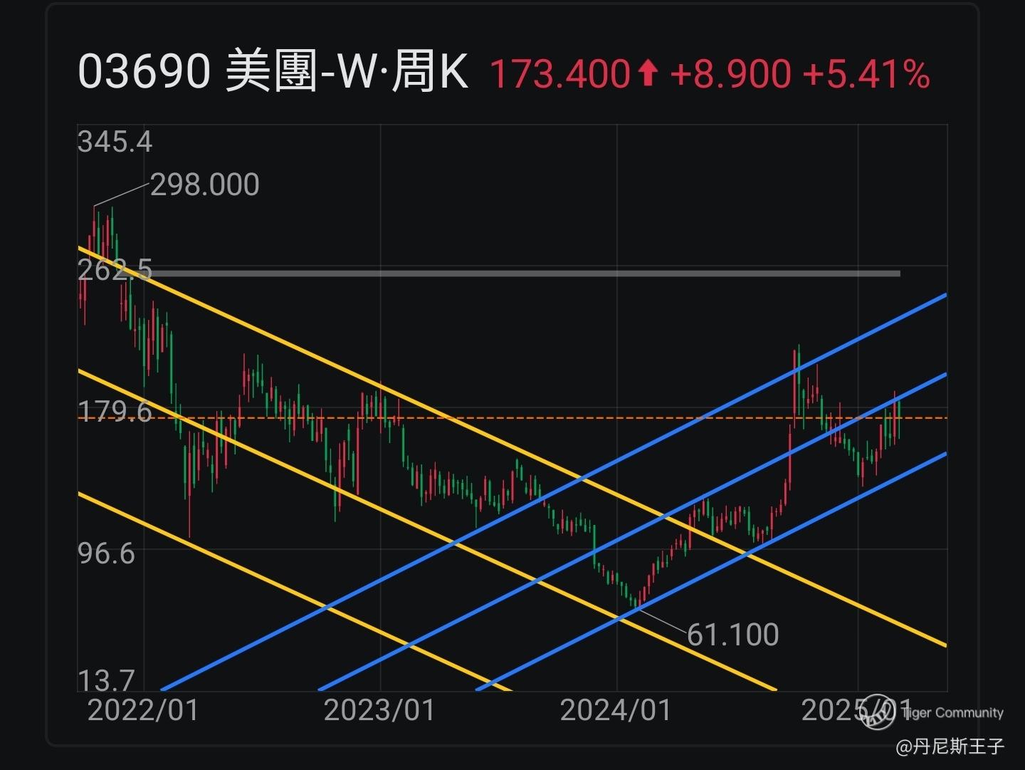 美团-W (03690.HK) 近期股价升至周线图上升通道线中轴。是突破定回落?