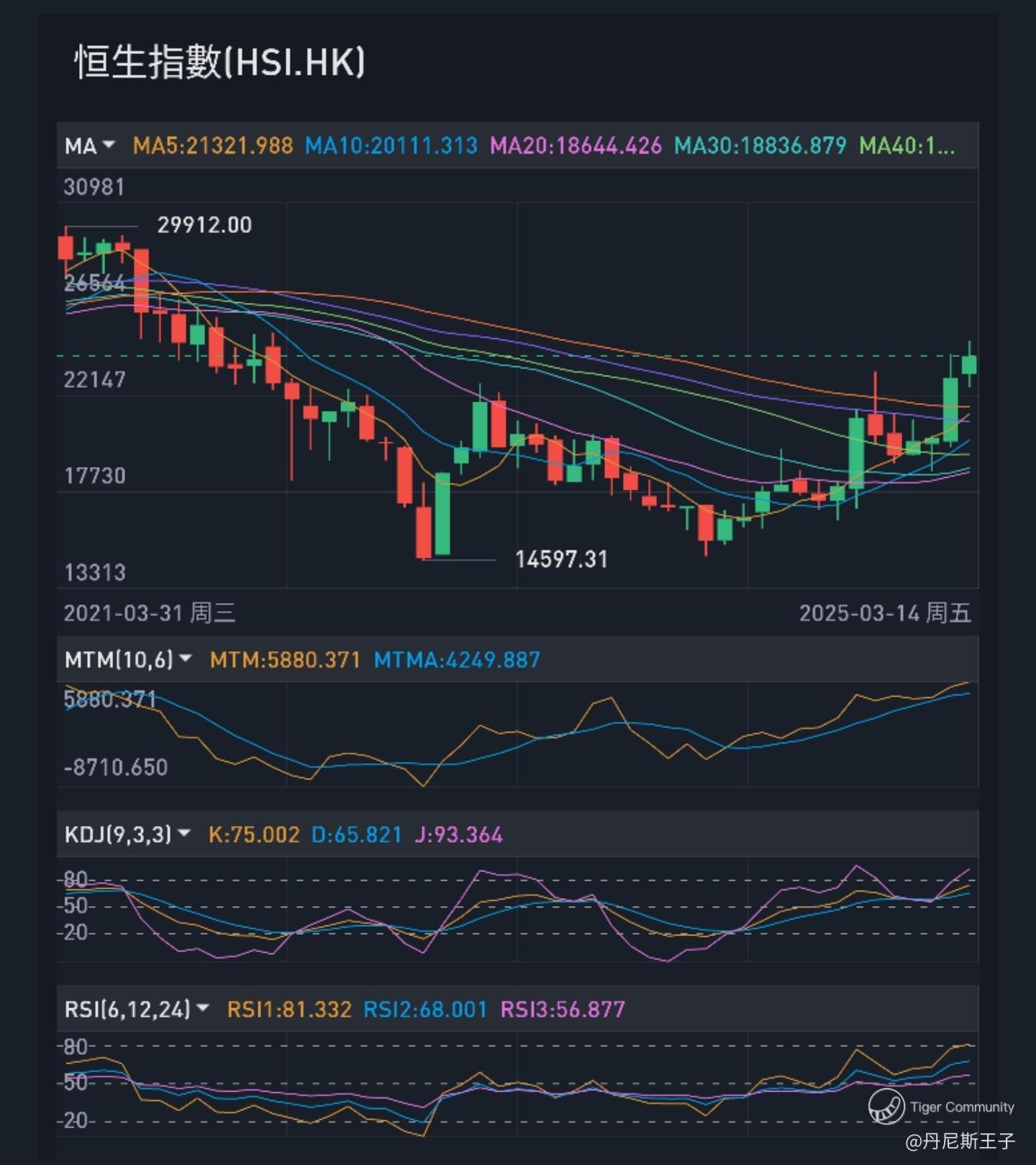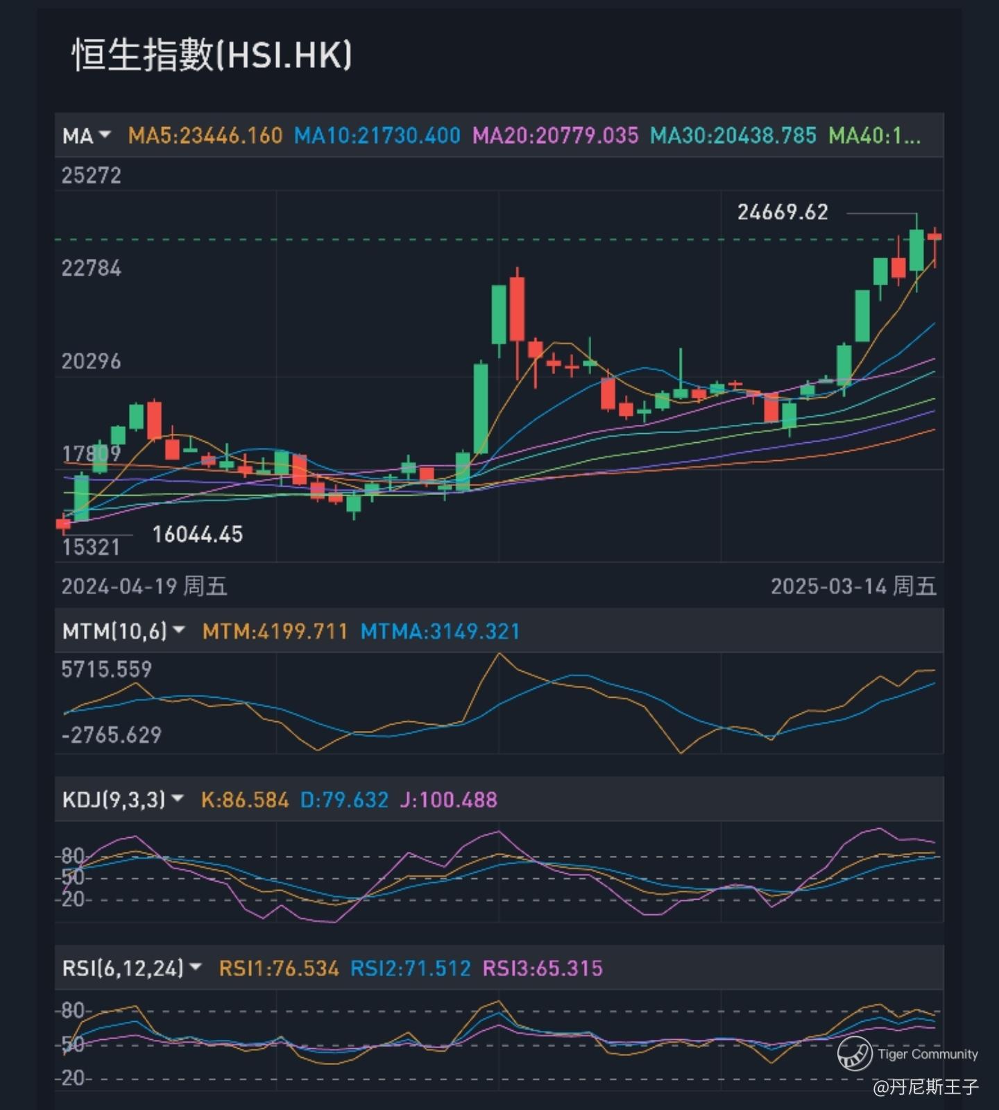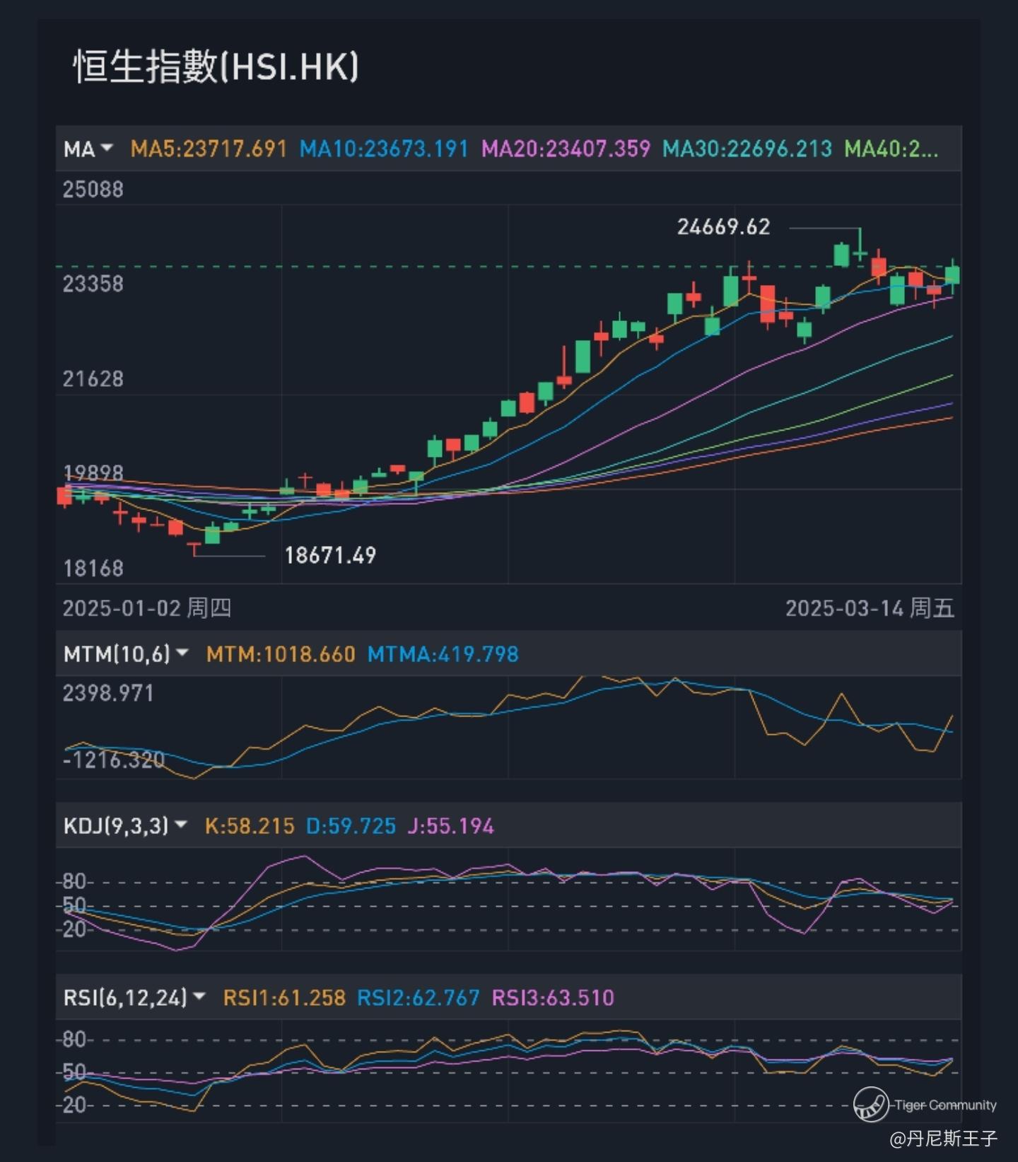 自2025年1月13日恒生指数由低位18671.49点向上反弹,短短两个月内于3月7日就升至24669.62点高位,累计升幅5998.12点,升幅惊人。