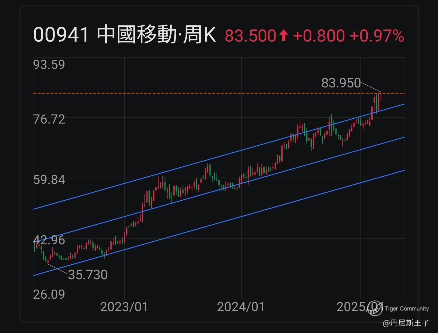 中国移动 (00941.HK) 近期股价突破周线图上升通道线上轴。是展开新的上升通通线,回落至上升通道线之内,还是开展下降通道线?