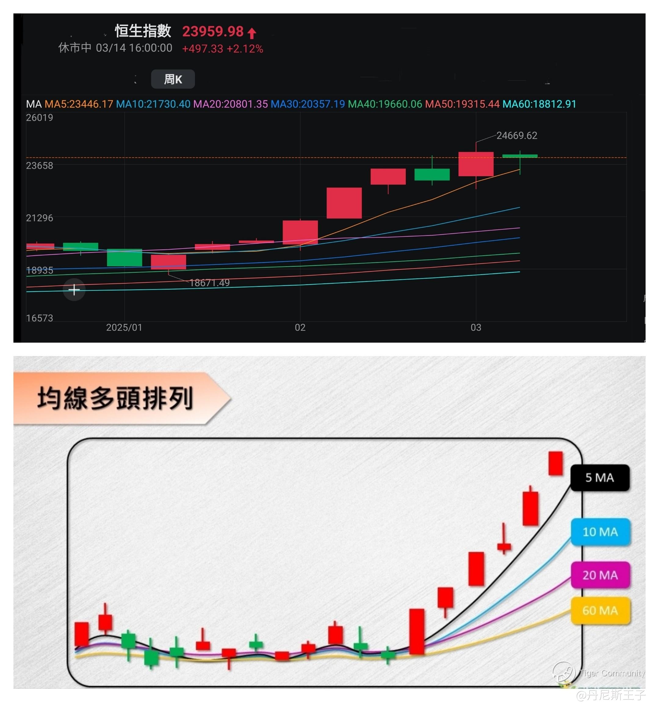 周线图:恒生指数(5,10,20,30,40,50,60)天移动平均线呈多头排列