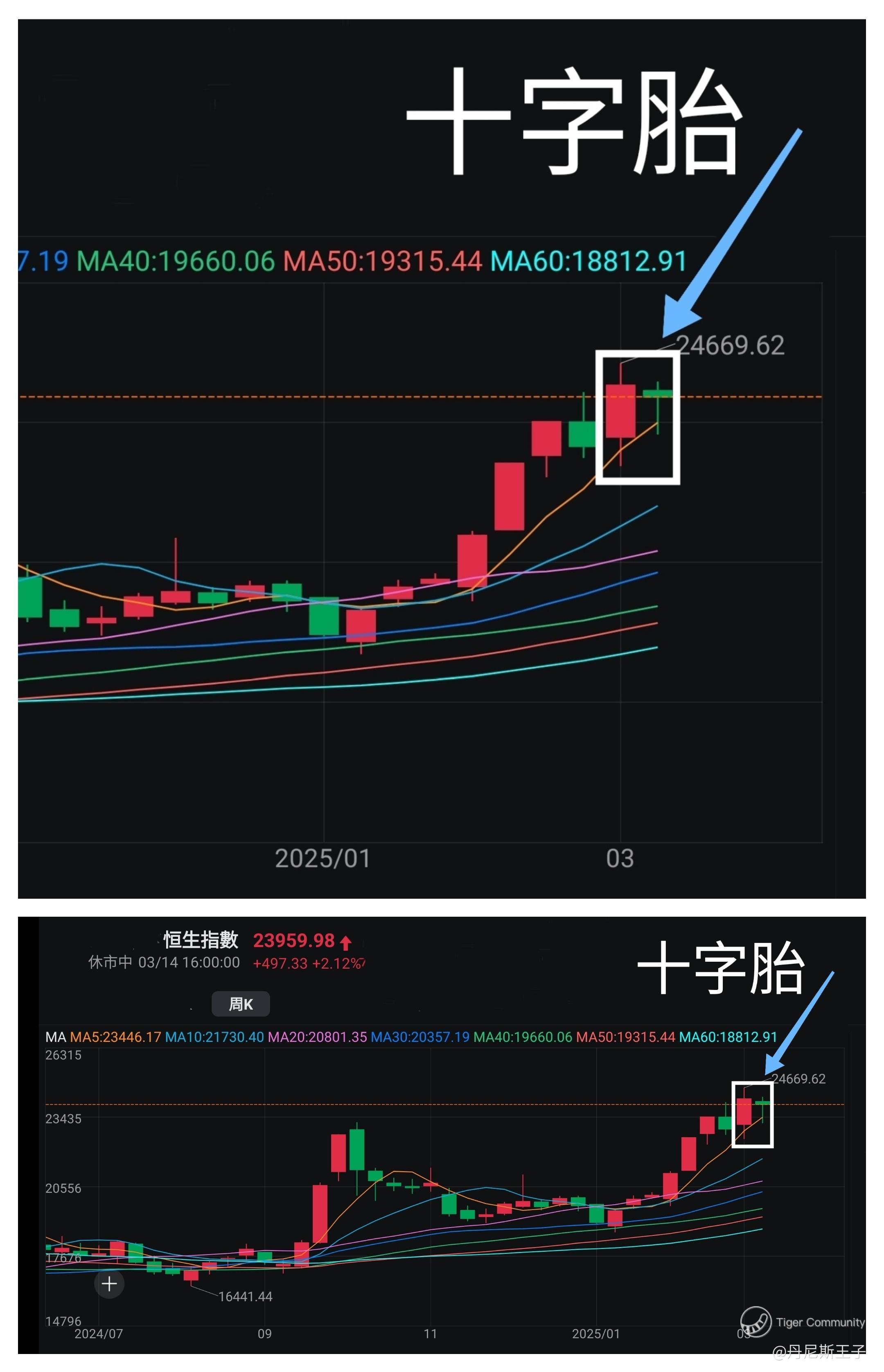 而从阴阳烛形态即出现了「十字胎」;高位见「十字胎」组合一向被视为有较大机会出现转向的可能性