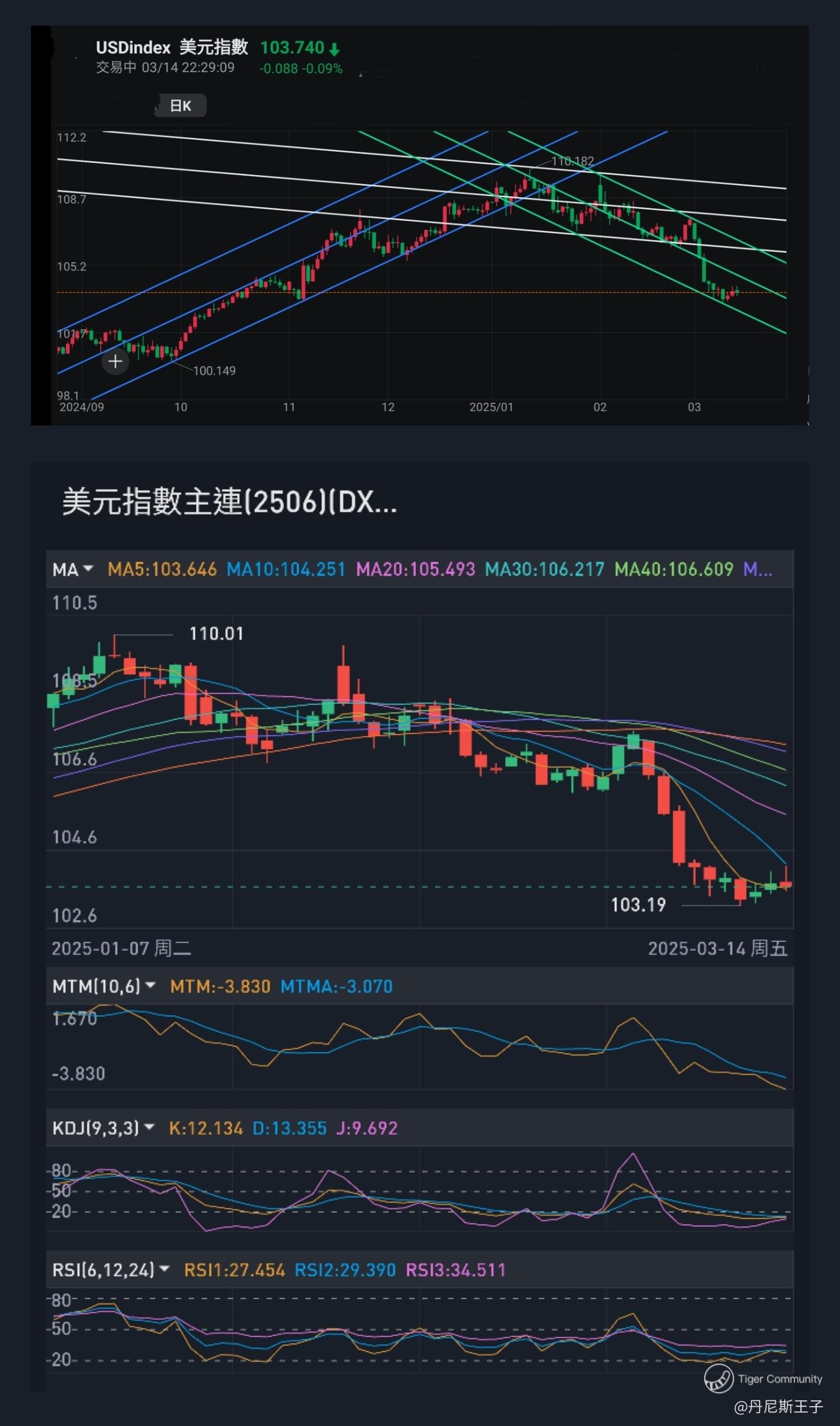 当前美元指数跌至下降通道线下轴,正可观察会否出现反弹。