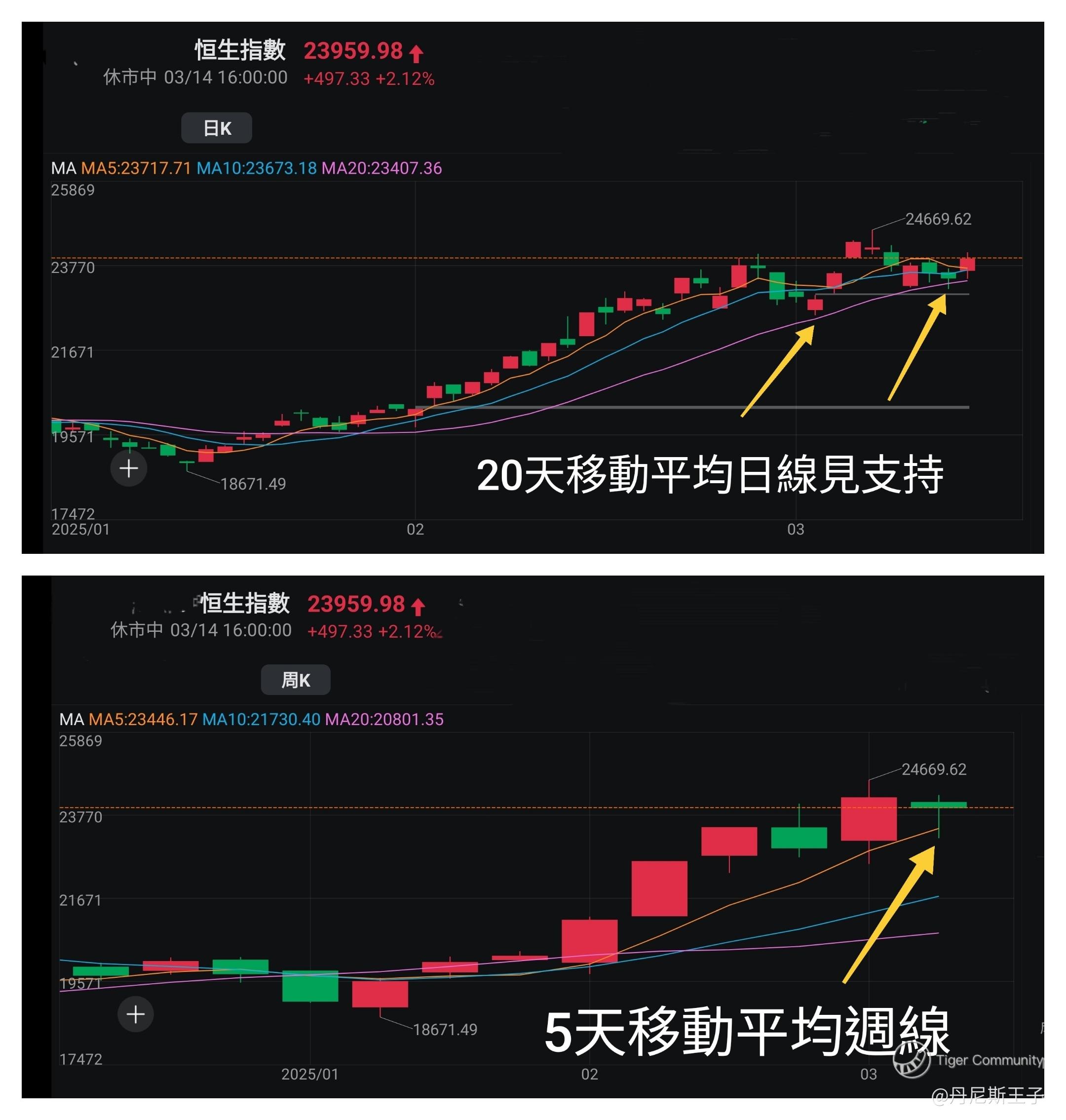 5天移动平均月线现时在21321点,距离恒生指数现价逾2600点距离,王子认为同样会增加向下调整压力。