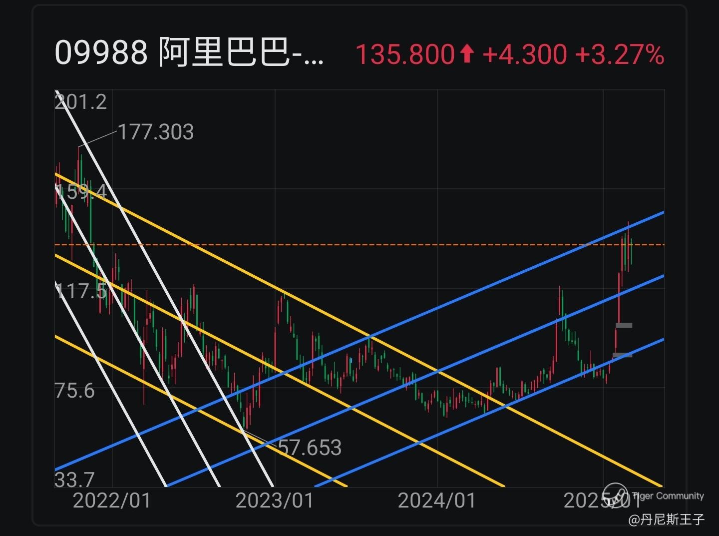 阿里巴巴-W (09988.HK) 近期股价升至周线图上升通道线上轴。是突破定回落?