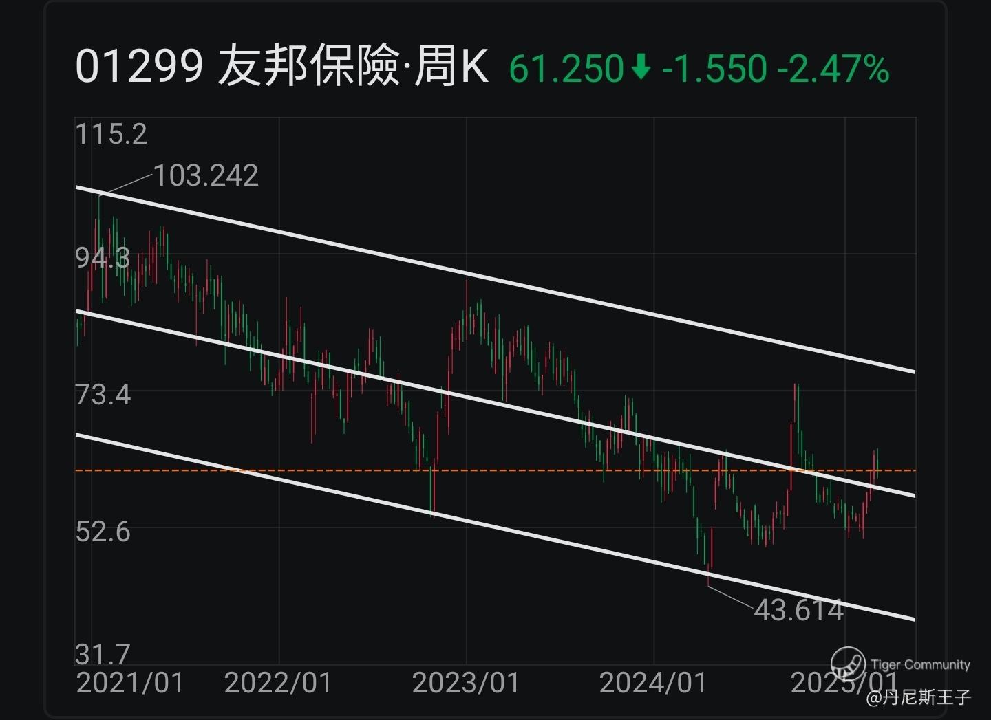 友邦保险 (01299.HK) 处于周线图下降通道线之内,能否向上继续反弹。