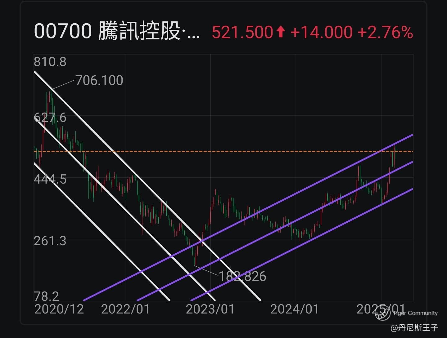腾讯控股 (00700.HK) 近期股价升至周线图上升通道线上轴。是突破定回落?