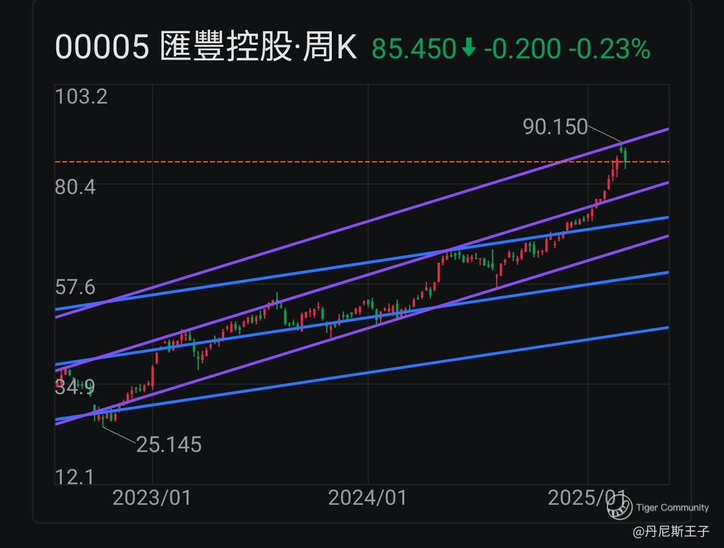 汇丰控股 (00005.HK) 近期股价升至周线图上升通道线上轴后回落。