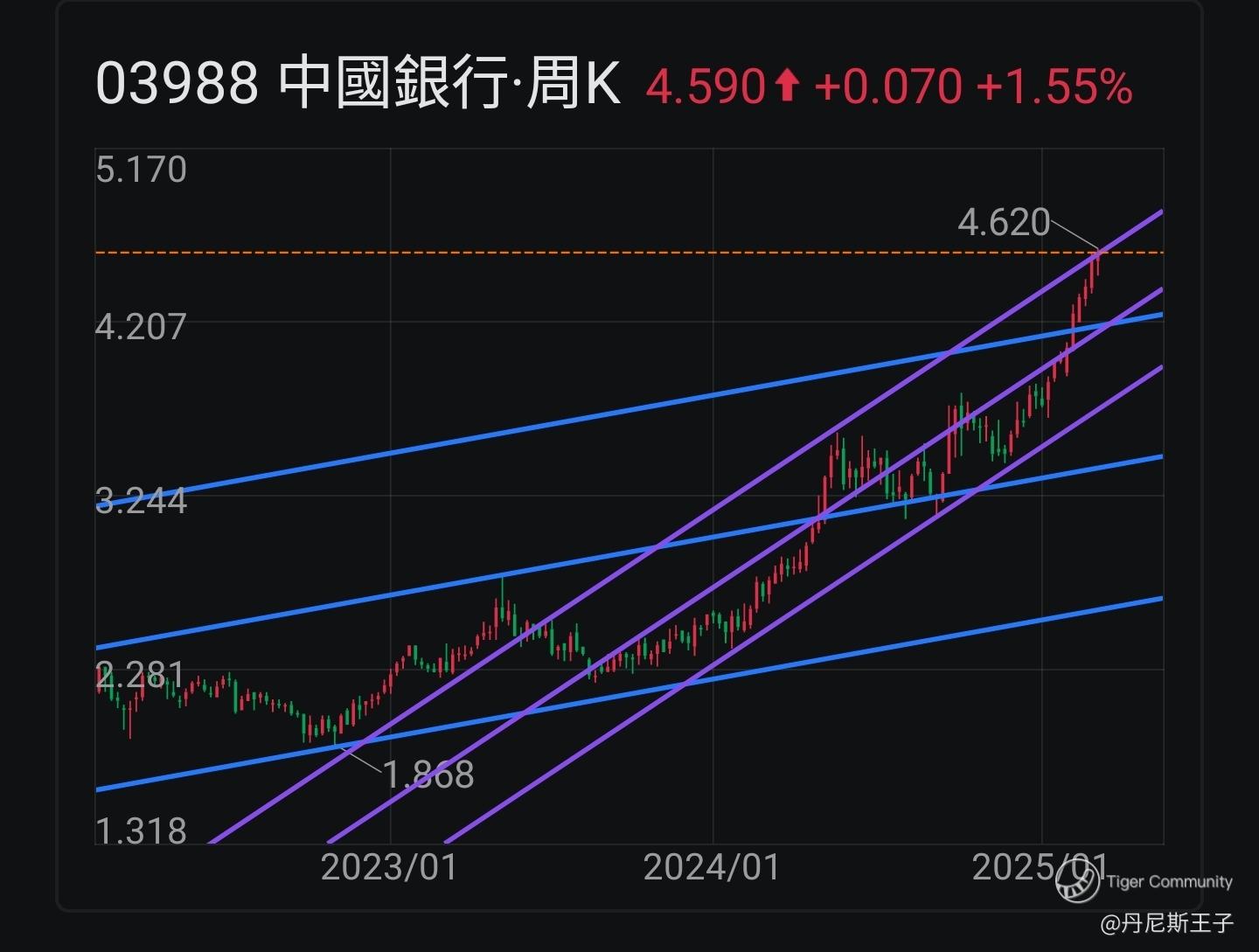 中国银行 (03988.HK) 近期股价升至周线图上升通道线上轴。是突破定回落?