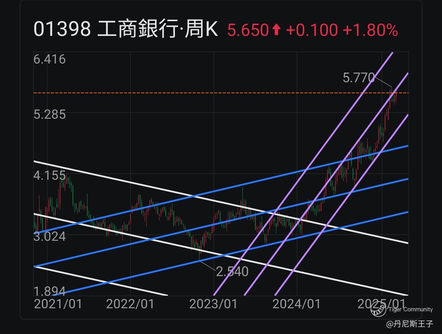 工商银行 (01398.HK) 近期股价升穿周线图上升通道线后,继续展开新的上升通道线,走势好强。