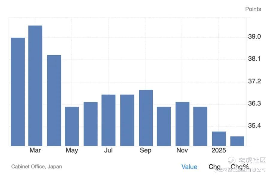 第二,作为发达经济体,消费占日本GDP的55%以上。可是2025年1月日本的消费信心指数再创新低,只有35,低于市场预期的35.7。其中情绪性指标都在下滑,比如生活水平、收入增长、购买耐用品的意愿等。