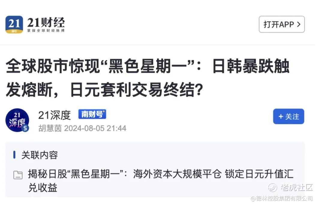 市场上有这么多以日元为基础的货币在套利,而此时日本因为综合因素出现了本土通胀上升,通胀原因包括美国投资日本维护产业链安全、日本资产价格上升、美国股市风险溢价上升等。日本央行2024年7月31日选择了加息来应对,结果日股熔断,美股也出现大幅下跌,纳斯达克指数从7月31日的17694下跌到8月5日的15708,跌幅11.2%。三周内全球股市蒸发6.4万亿美元,当时这一情况被媒体称为“黑色星期一”的重演。日本首相也因此下台(细节请参考《拨云见“日”——日本首相人选的底层逻辑》)。