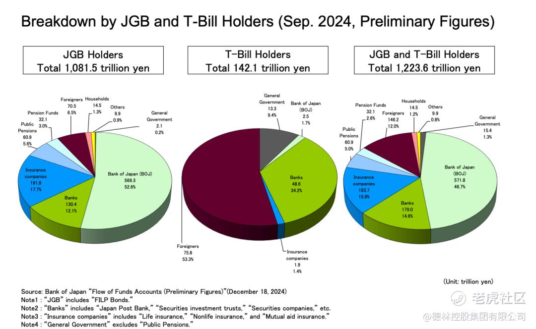 当然,日本的情况有很大弹性,因为日本的国债47%是日本央行持有,国际投资者持有仅12%,其他日本国内投资者持有41%(银行、保险30%,其他10%)。