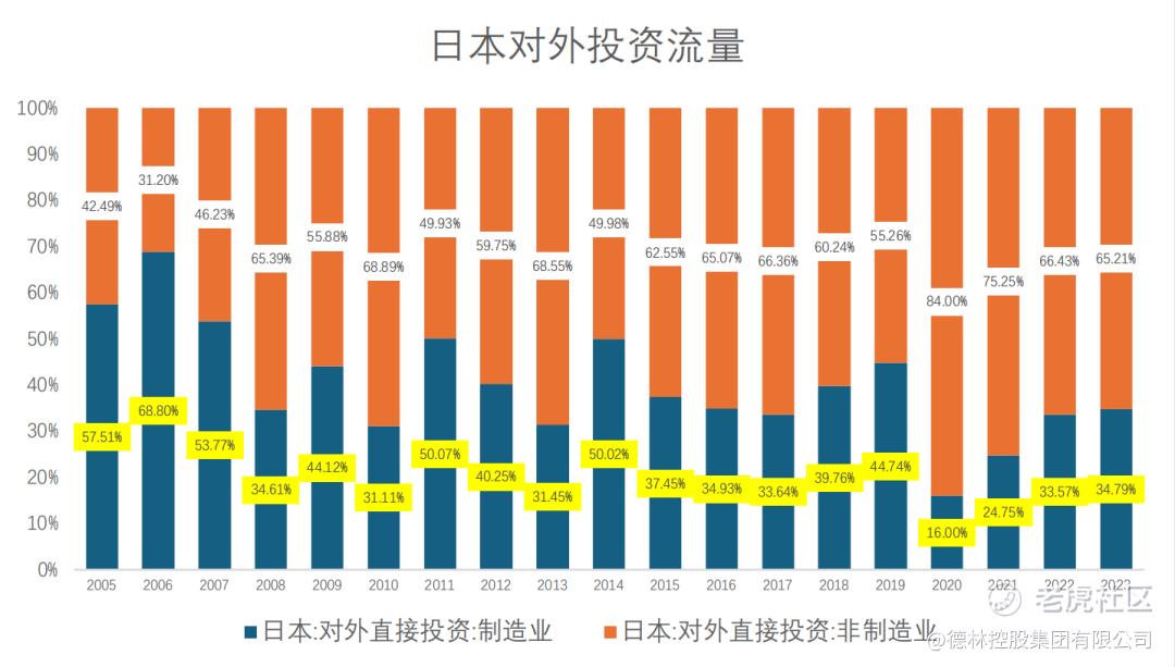 制造业占比下滑的背后其实是日本的产业空心化。另一个数据也可以得出相同的结论——日本的对外投资比例。2008年以前制造业占对外投资的比重都超过50%,2008年到2019年下跌到40%左右,2020年以后则跌倒30%以下。日本对外投资也变成了金融和服务业为主。