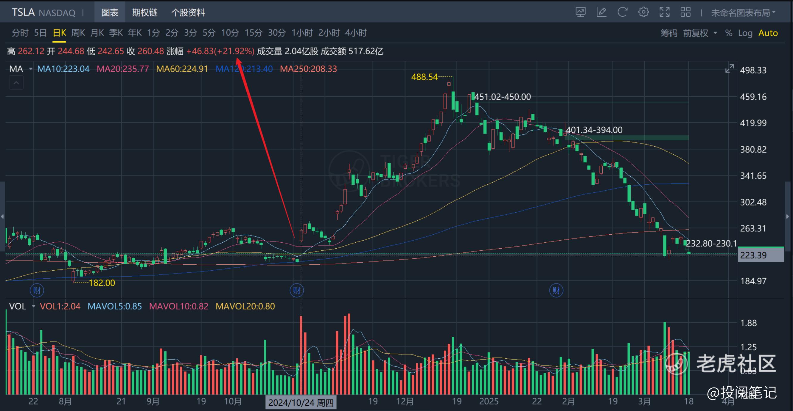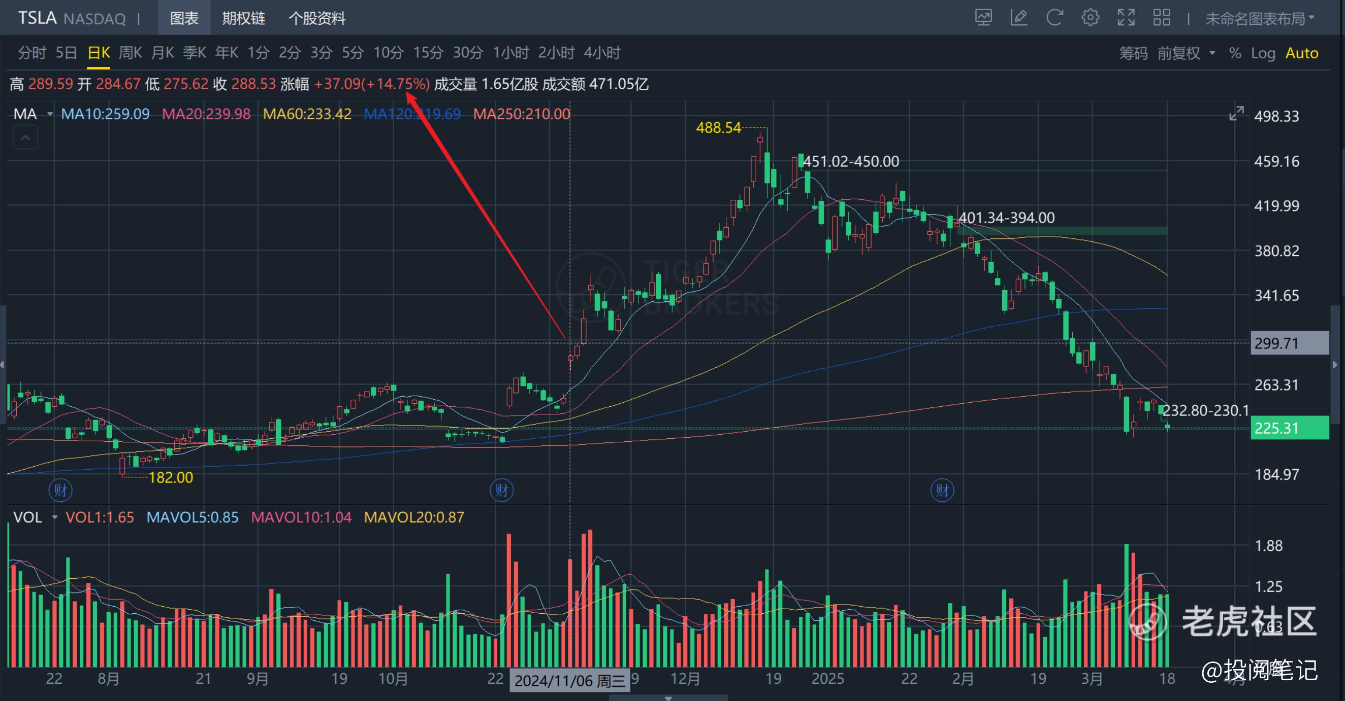 可以看到特斯拉第三季度营收仅增长8%,这增速真的低,那么看下市场在特斯拉业绩公布后股价表现:特斯拉股价在24日迎来了跳空高开,最终以21.92%的涨幅收盘,之后继续股价迎来了一波小幅下跌,不过股价在11月6日继续跳空高开,当日收涨14.75%,这股价反应主要是受事件驱动:总统候选人特朗普锁定胜局。