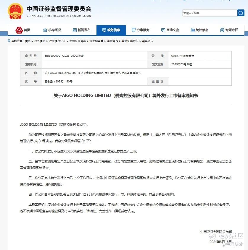 中国证监会3月18日公示关于AIGO HOLDING LIMITED(爱购控股有限公司)境外发行上市备案通知书