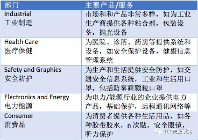 然而,3M所涉猎的行业可不仅仅是消费品,其行业和产品分布可谓非常广阔。下面这张表详细介绍了3M的整体业务