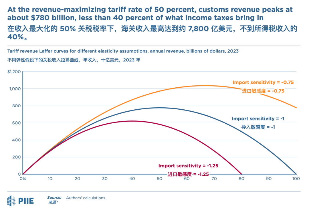经济学家阿瑟·拉弗(Arthur Laffer)用拉弗曲线(Laffer Curve)揭示,高税率未必带来高收入,反而可能扼杀经济活力。彼得森国际经济研究所的分析进一步指出,若要以关税完全取代所得税,所需税率将远超市场与现实的承受能力。