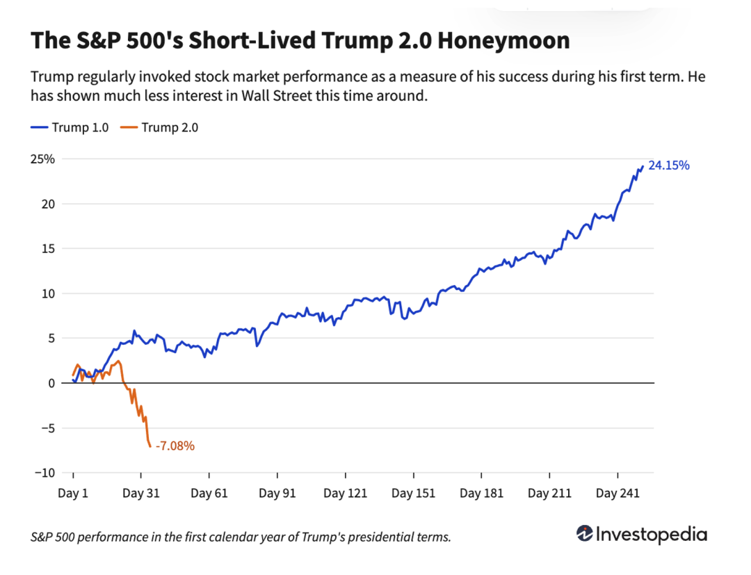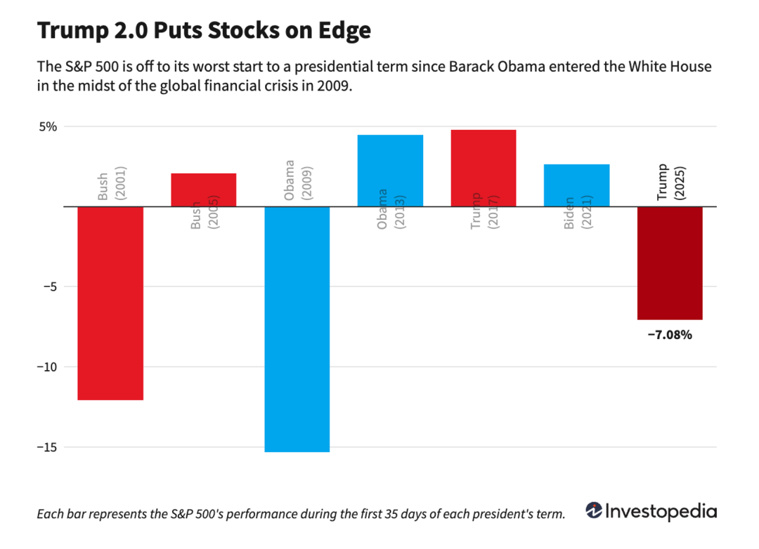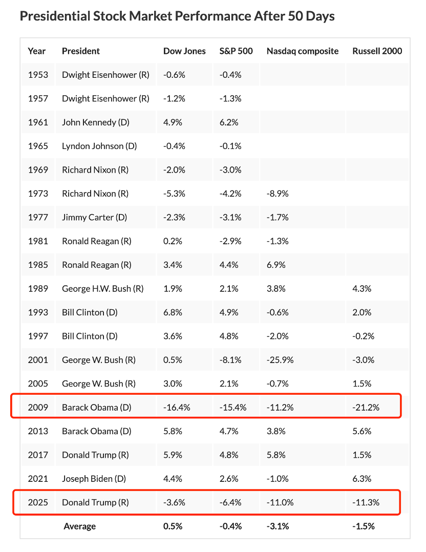 标普500指数自特朗普2.0当选以来的涨幅已悉数回吐,纳指一度跌逾11%,显露技术性熊市迹象。股市在其任期50天内创下了自 2009 年奥巴马第一任期以来的最差表现。